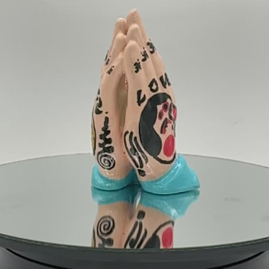 Original one-of-a-kind hand-painted ceramic praying hands (blue). Approx. 4 inches tall.